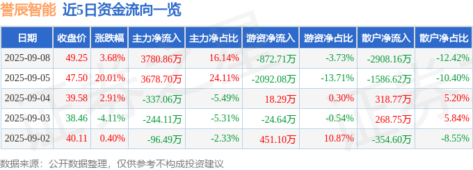 “ 开云官方证券之星消息,截至2025年9月8日收盘,誉辰智能(688638)报收于49.25元,上涨3.68%,换手率17.53%,成交量4.64万手,成交额...